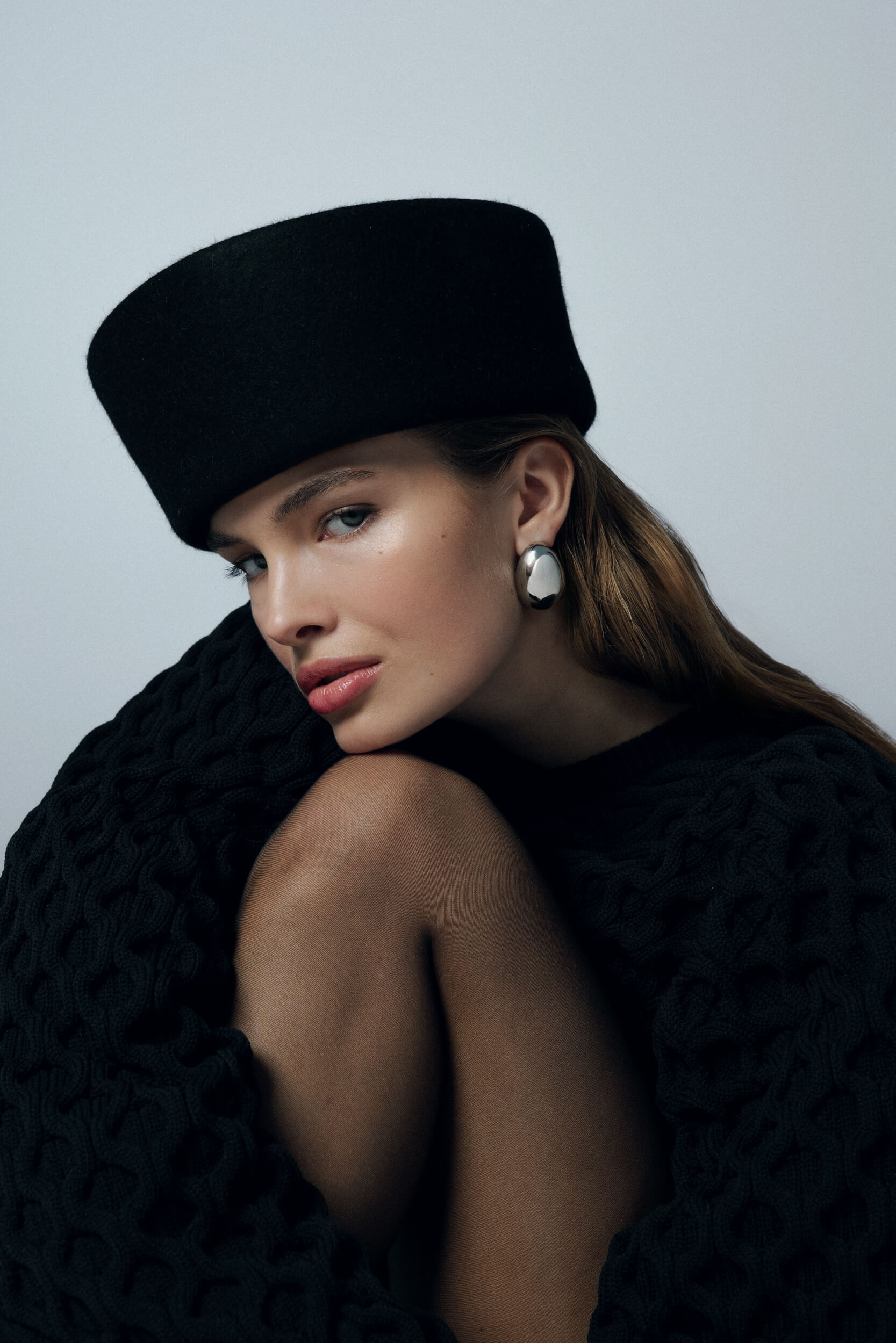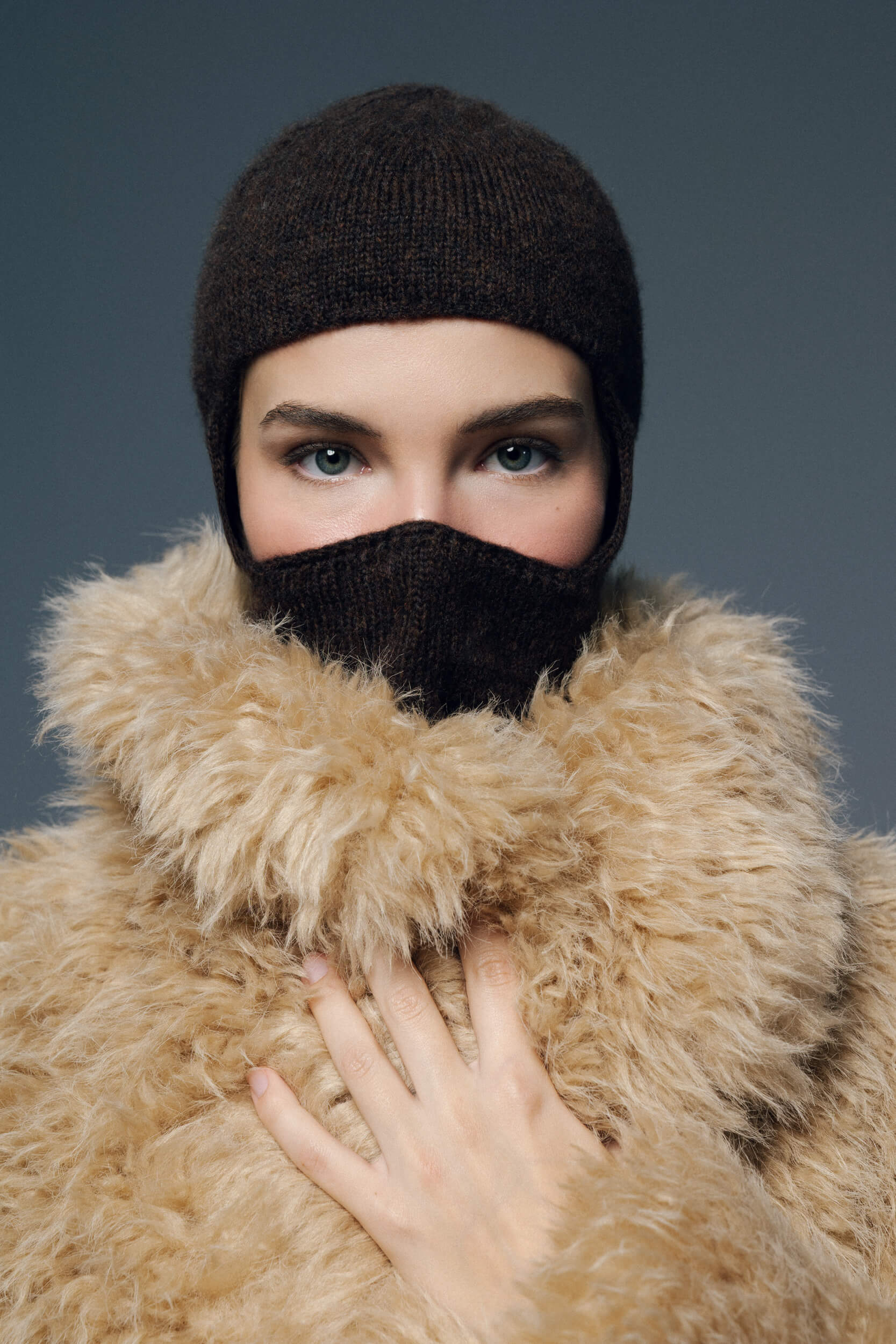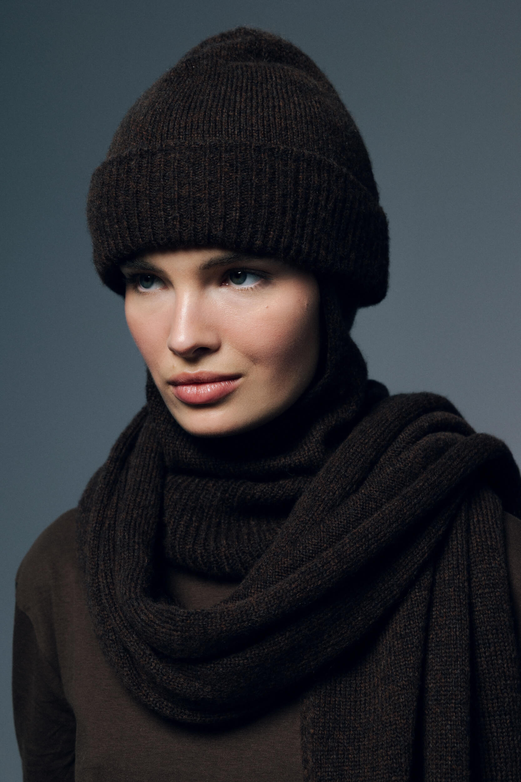 Kolekcję uzupełnia zimowy bucket hat w odcieniu ciemnej czekolady – miękka, strukturalna forma o rzeźbiarskim charakterze.