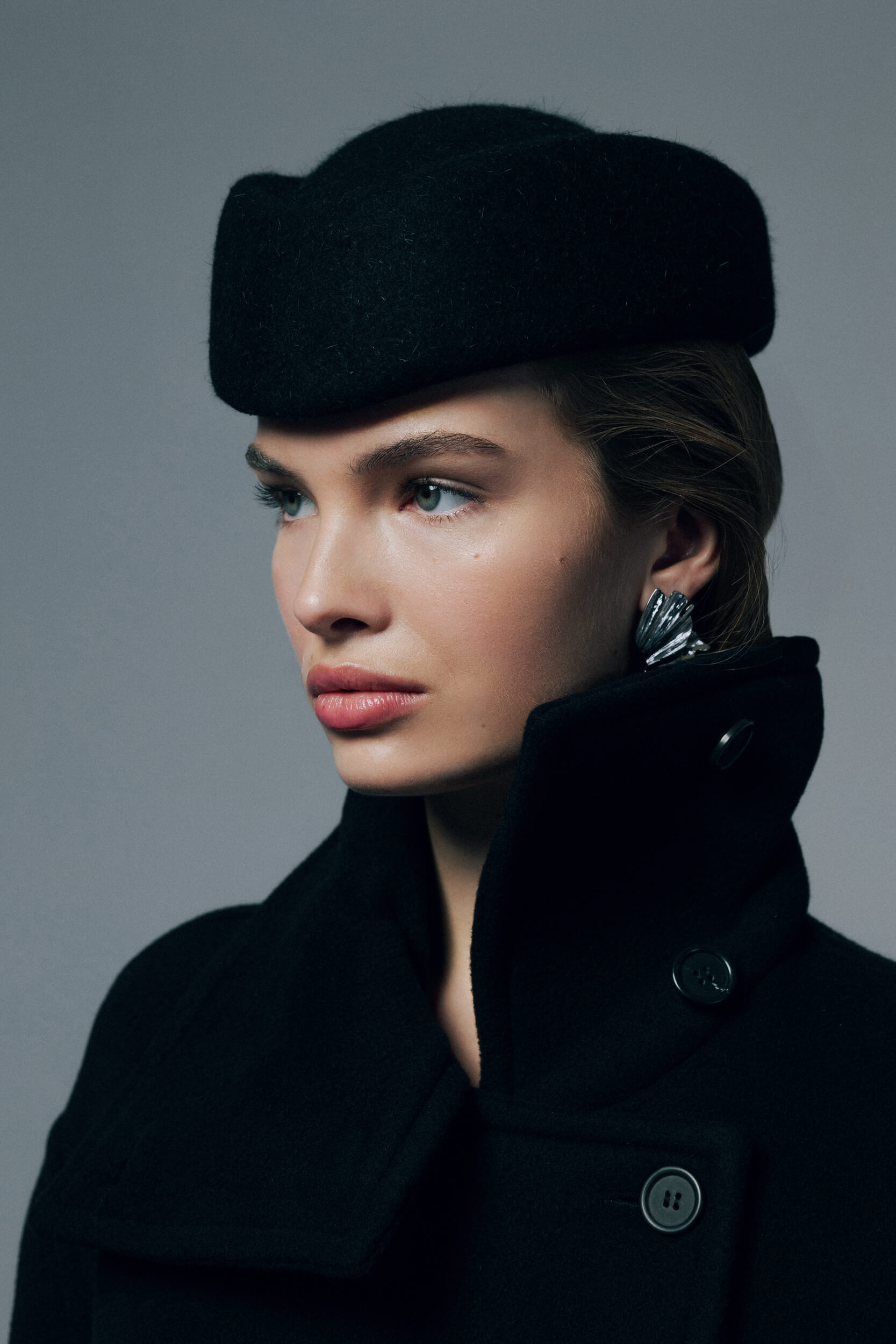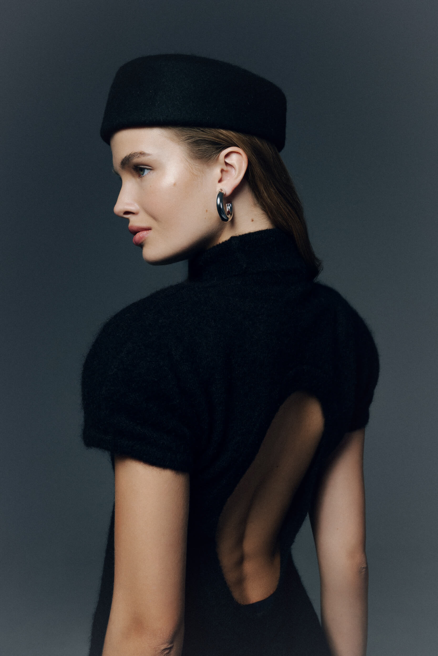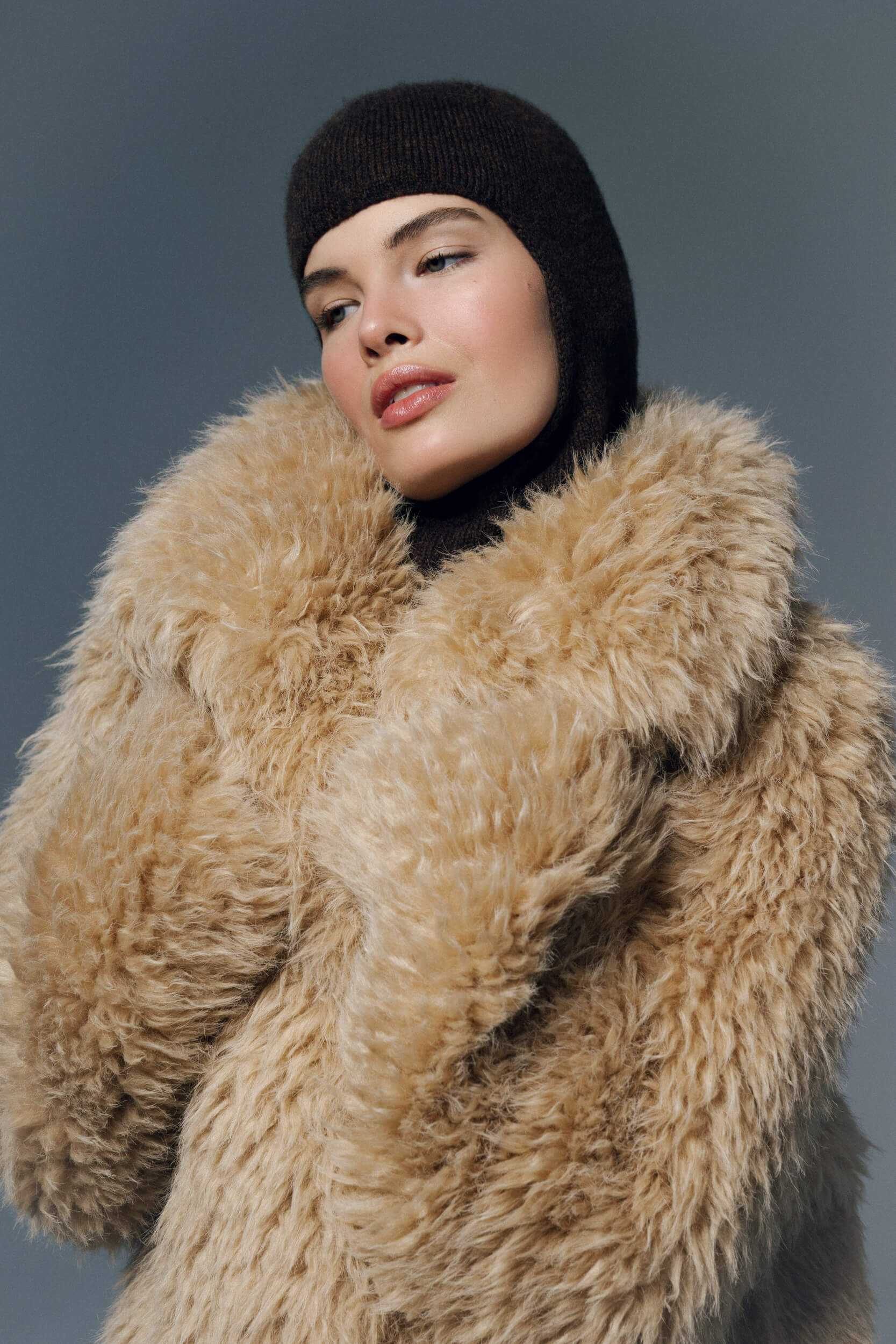 Kolekcję uzupełnia zimowy bucket hat w odcieniu ciemnej czekolady – miękka, strukturalna forma o rzeźbiarskim charakterze.