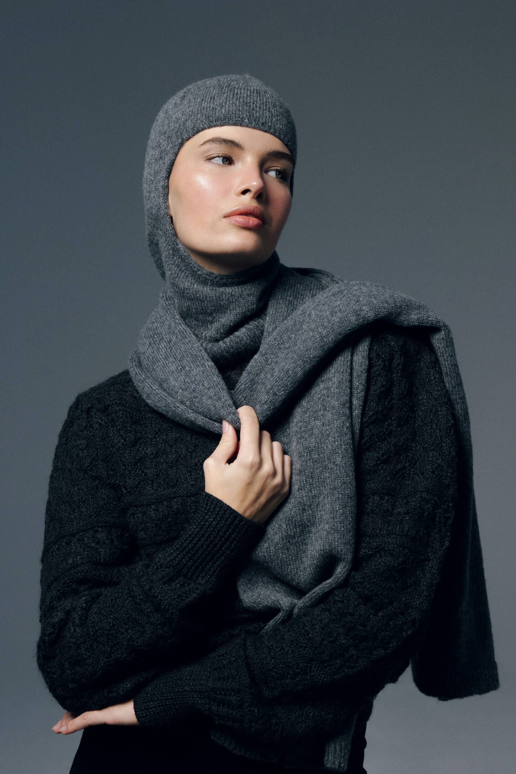 W kolekcji znalazły się wełniane komplety: czapka, kominiarka i szalik, zaprojektowane z myślą o swobodnym łączeniu i warstwowaniu. Dostępne w czterech odcieniach – beżowym, ciemnej czekoladzie, ciemnym szarym i off white – wykonane zostały z miękkiej wełny Merino (75%) z dodatkiem poliamidu (25%), zapewniającej ciepło, lekkość i trwałość.