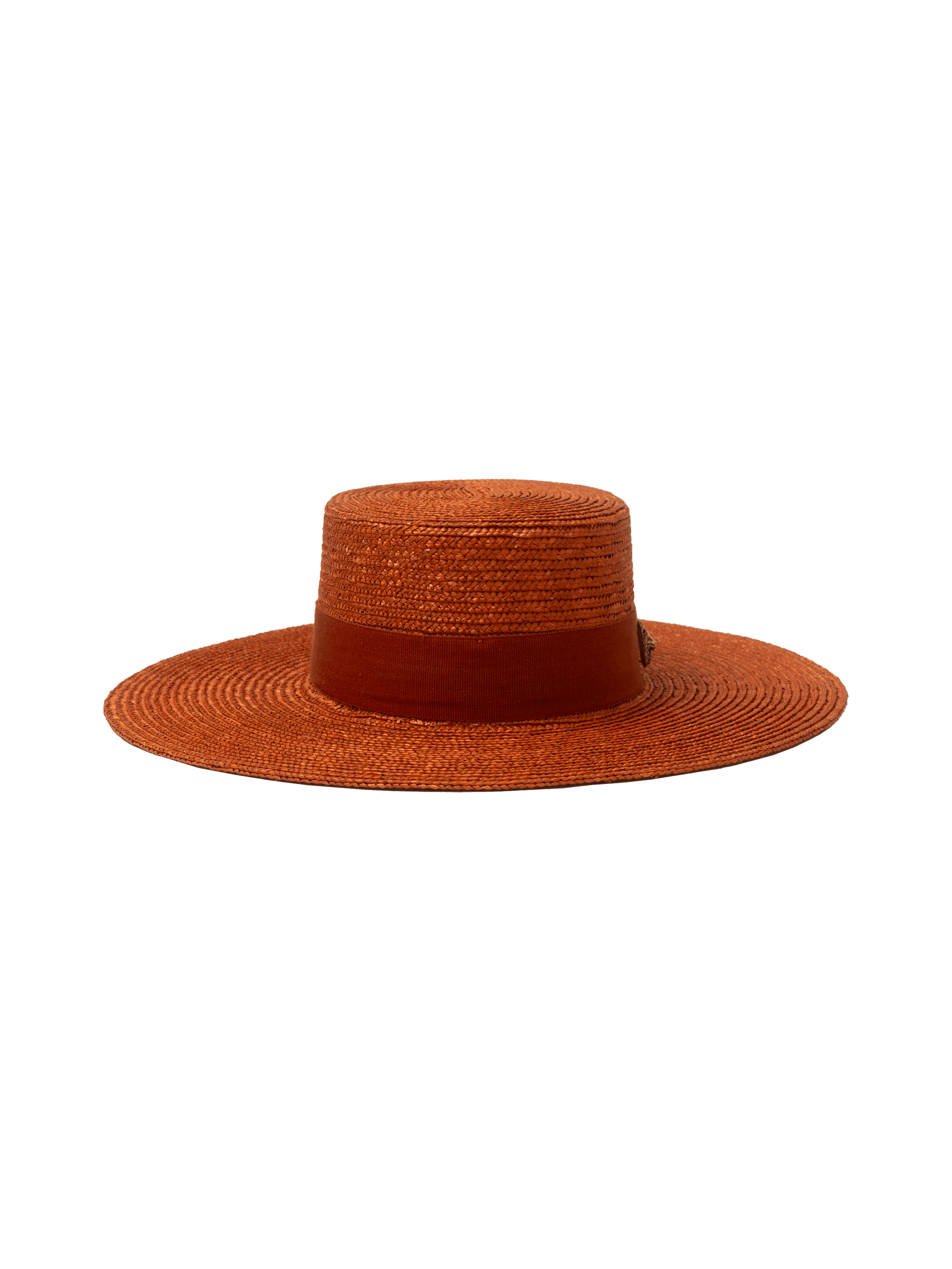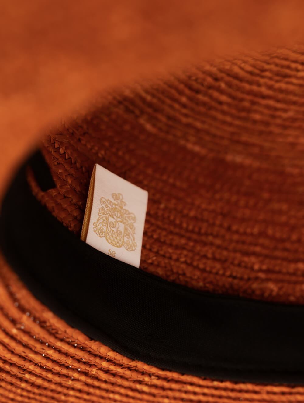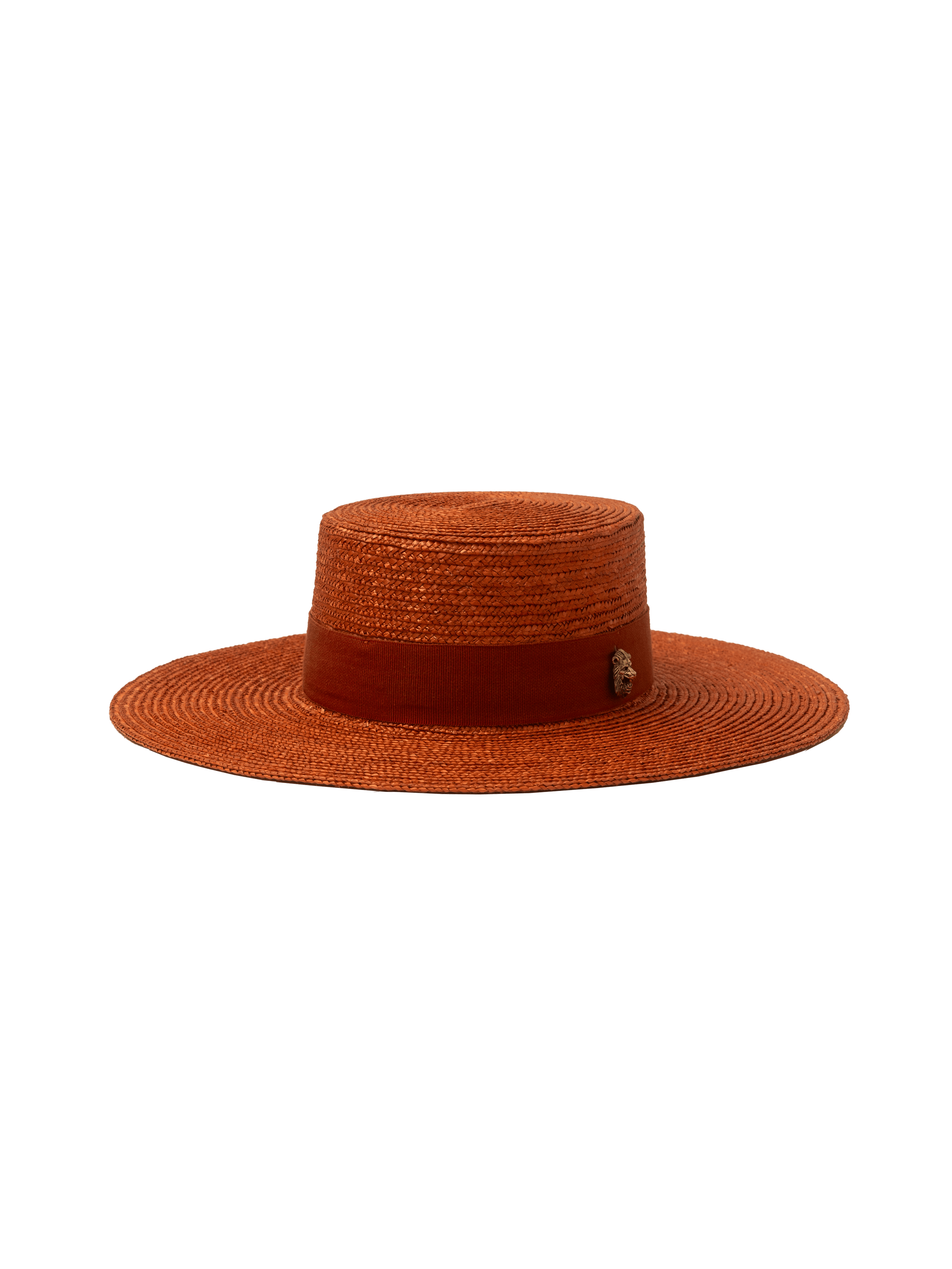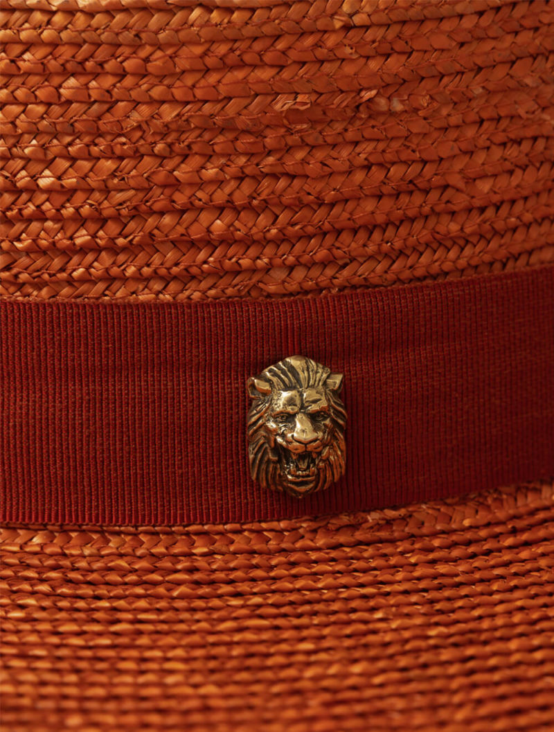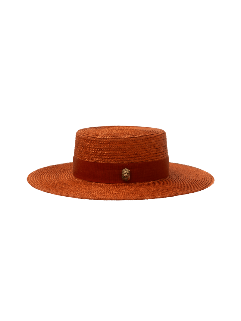 Kanotier z dużym rondem z naturalnej słomy, regulowanym potnikiem, marchewkową wstążką i mosiężnym lwem na niej.