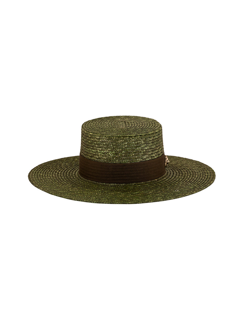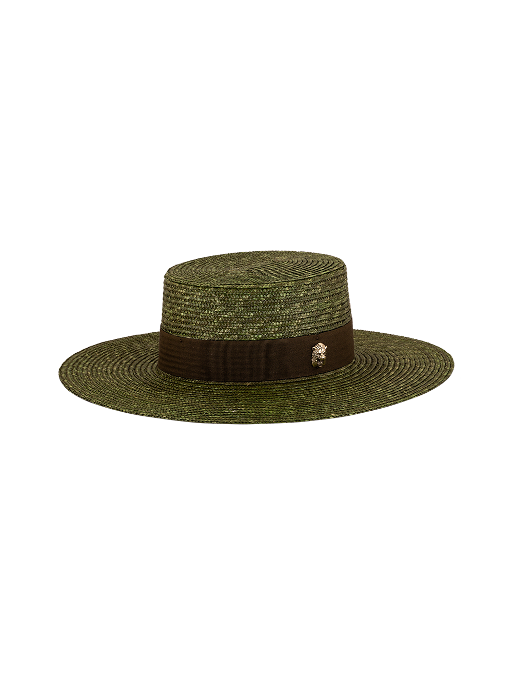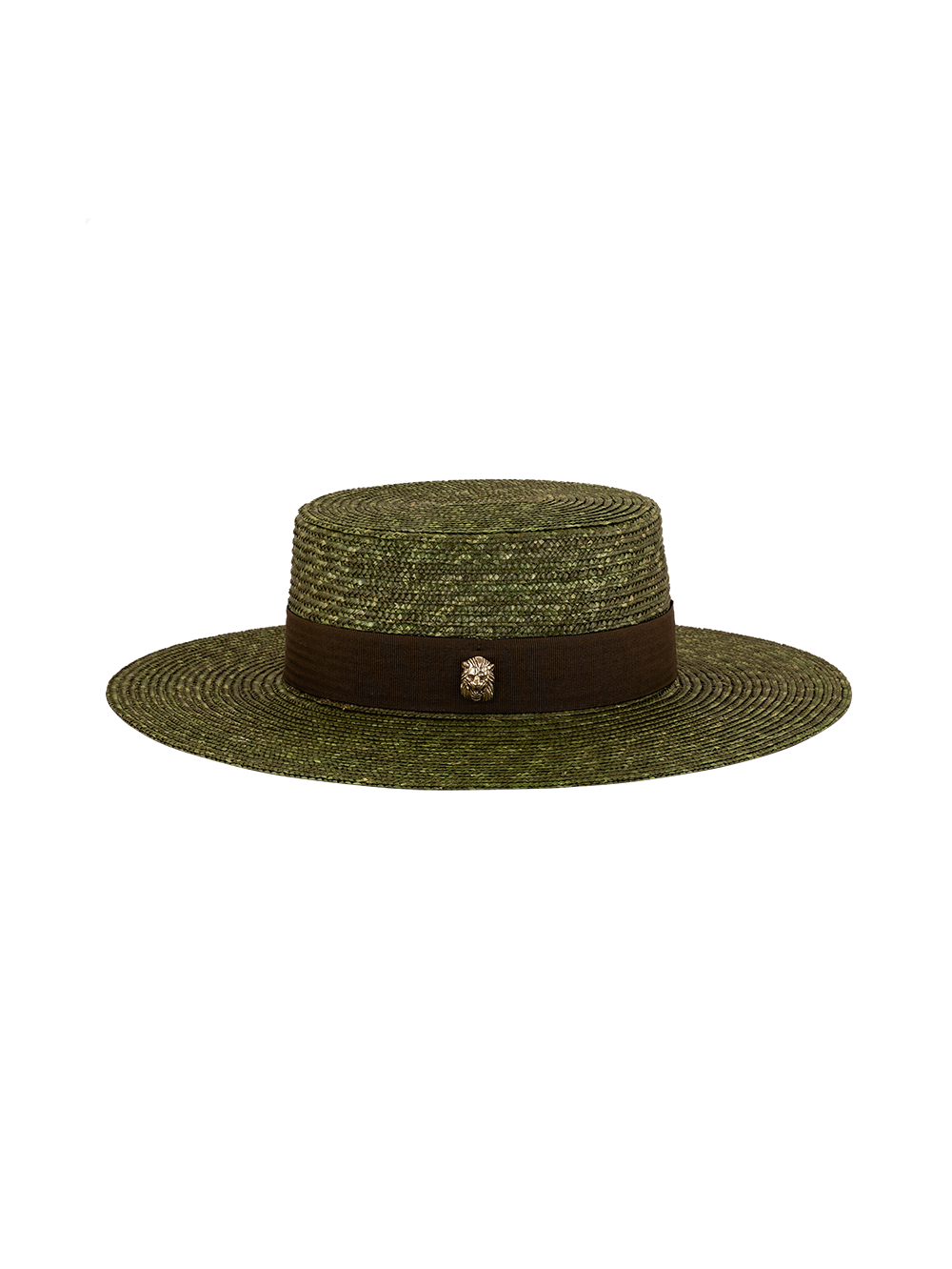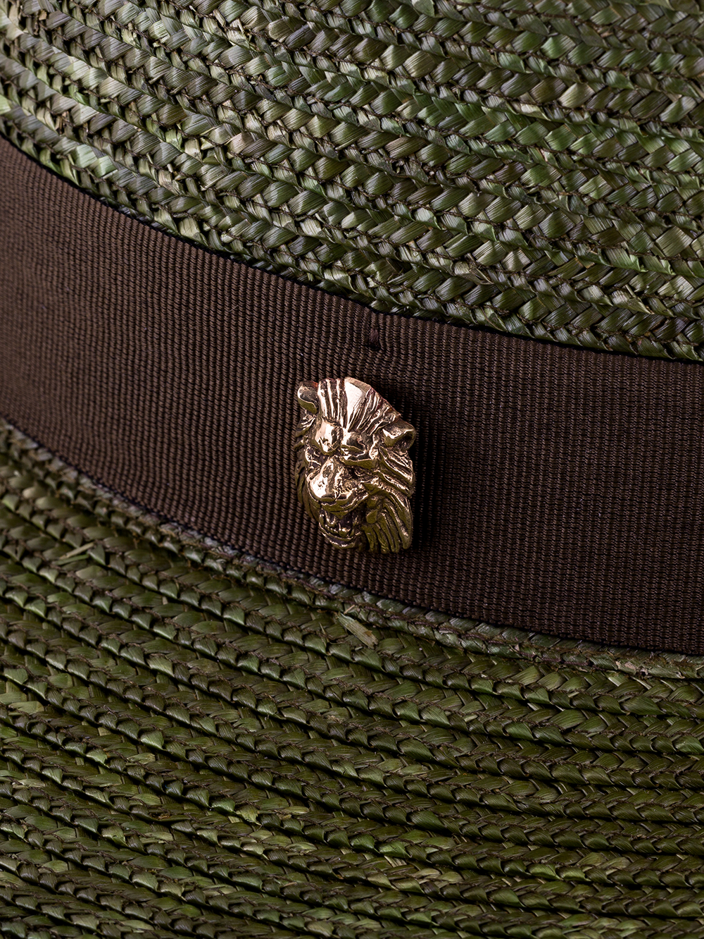 Kanotier z dużym rondem z naturalnej słomy, regulowanym potnikiem, zieloną wstążką i mosiężnym lwem na niej.